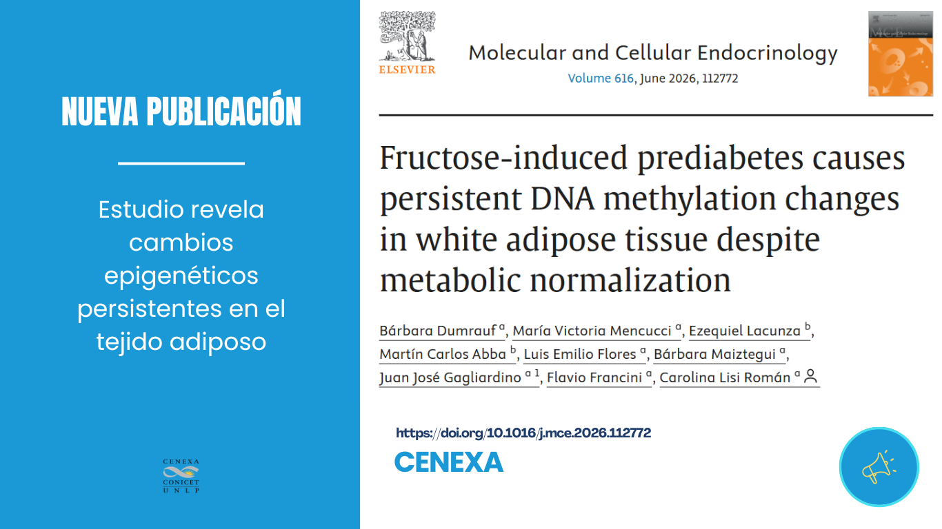 Un equipo de investigación del Centro de Endocrinología Experimental y Aplicada (CENEXA-UNLP-CONICET, CeAs-CICPBA), encabezado por la Dra. Carolina Lisi Román e integrado por la Lic. Bárbara Dumrauf y los doctores María V. Mencucci, Luis Flores, Bárbara Maiztegui, Juan José Gagliardino y Flavio Francini, junto con los doctores Ezequiel Lacunza y Martín Abba del Centro de Investigaciones Inmunológicas Básicas y Aplicadas (CINIBA), publicó en la revista científica Molecular and Cellular Endocrinology el trabajo titulado “Fructose-induced prediabetes causes persistent DNA methylation changes in white adipose tissue despite metabolic normalization”. El estudio aporta evidencia novedosa sobre los efectos tempranos de una alimentación rica en fructosa en el desarrollo de la prediabetes.